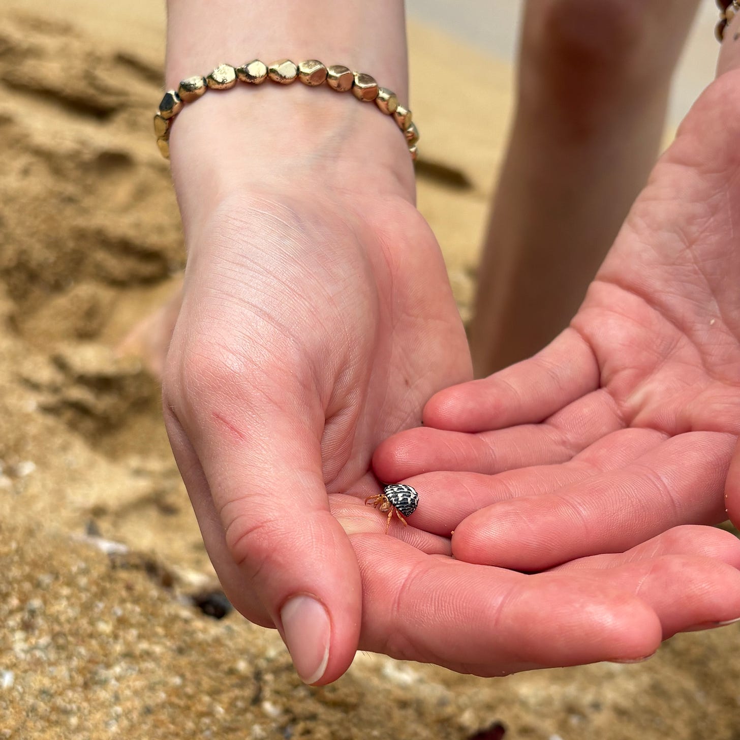I’m reminded of the tiny crab we found yesterday. His shell was no more than a centimeter wide, round with black stripes. His tiny little legs and claws stuck out the front of the shell and on closer examination, his two little eyes were round and black and stuck out far from his shell. My daughter found him in the sand and promptly placed him on my knee. Which I was not expecting, nor was I excited about. So I brushed him off, not fully realizing what I was doing. He landed back in the sand, unharmed at least to our human eyes.